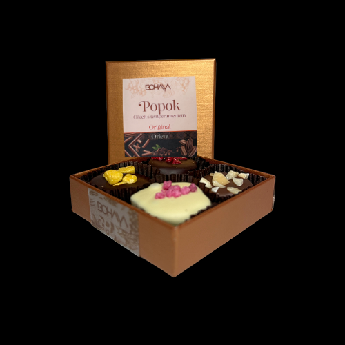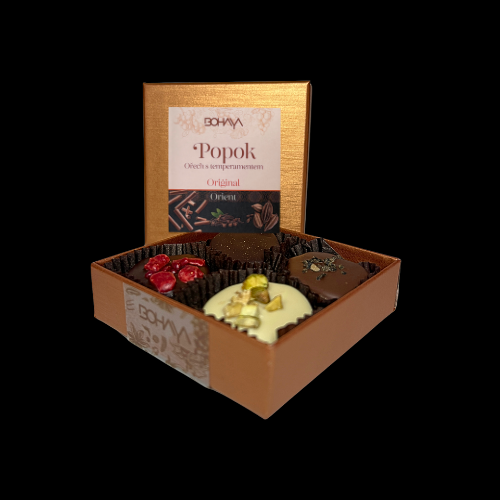 Neobyčejné pralinky. Jemné želé z redukovaného hroznového moštu s celými půlkami vlašského ořechu, s orientálním kořením obalené v prémiové čokoládě doladěné posypy.