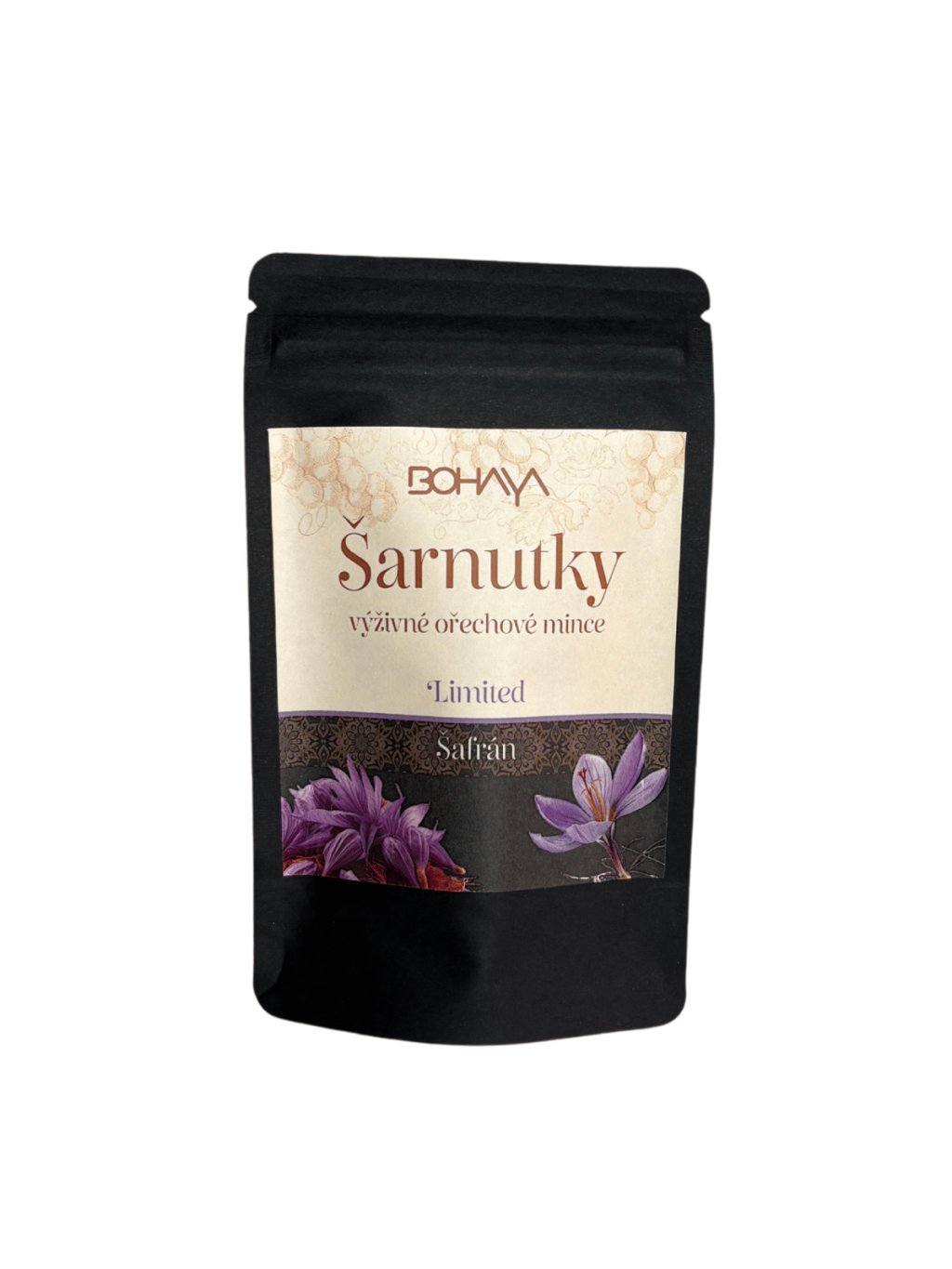 Výživné ořechové mince z celých půlek aktivovaných vlašských ořechů, hroznového moštu a pravého šafránu – jednoho z nejvzácnějších a nejdražších koření na světě.